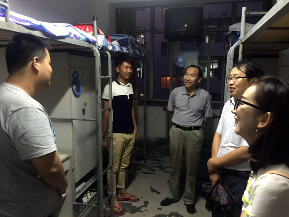 8月24日晚,必发7790电子集团(新闻学院)党委书记符得团、院长徐兆寿、党委副书记、副院长王德祥、副院长陈积银、杨华以及团委书记赵洁以及各班班主任老师对2016级研究生、本科新生宿舍进行走访。